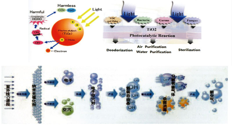 通过特定波长光线照射,激活纳米光催化剂,生成电子一空穴对,使光催化剂与周围的H2O分子、O2分子发生作用。结合生成氢氧自由基OH。通过氢氧自由基OH层层锁住空气中各种有害成分,分解有害成分分子构造,抑制细菌生长和病毒的活性能力,从而达到杀菌,空气净化、除臭、防霉,消除空气污染的目的。