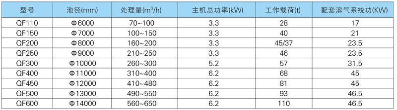 注:1、表中处理量适合于污水处理系统,表中处理水量依据:回流比R=30%,水力表面负荷:q=5-8m3/m2.h。