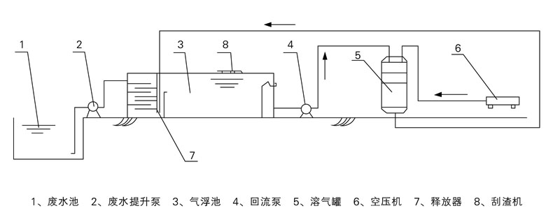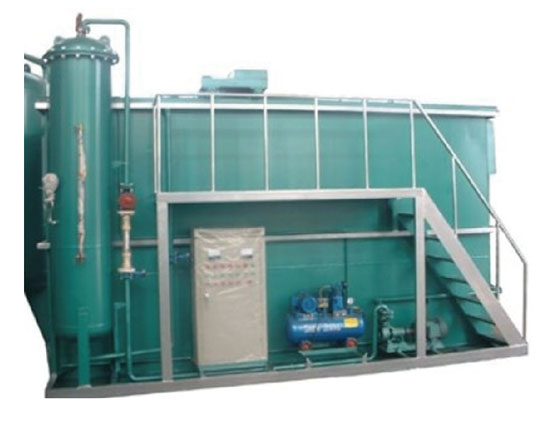 本设备的工作方法属于加压溶气气浮法,其工作原理:在一定条件下,将大量的空气溶于水,形成溶气水,作为工作介质,通过释放骤然减压,快速释放,产生大量的微细气泡,粘附于经过混凝反应后的废水中的“矾花”上,使絮体上浮,由专用刮渣装置刮除浮渣、浮油,达到固液分离的目的。