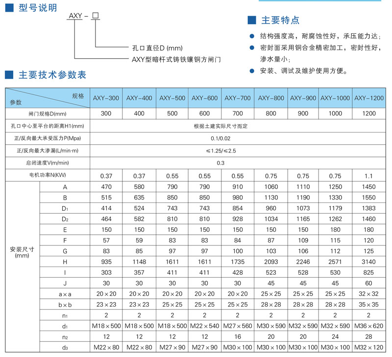 AXY型暗杆式铸铁镶铜圆闸门常用于给水、排水、防汛等水利工程,用于截断或疏通水流;尤其是公园、风景区、道路工程等不允许明杆式方闸门安装的场所。