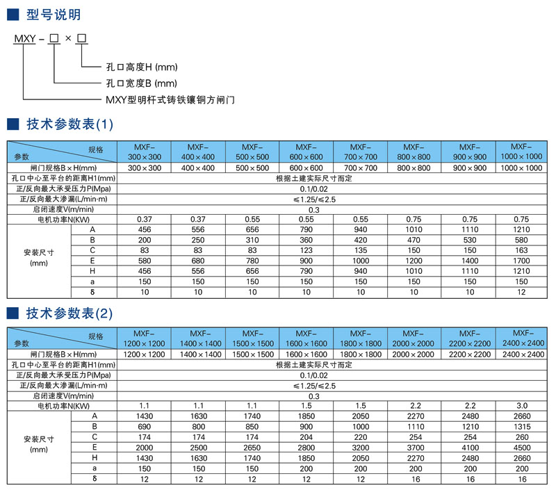 MXY型明杆式铸铁镶铜方闸门主要用于灌溉、防汛、水利水电、污水处理厂及自来水厂等给排水工程,用来截断或疏通水流。