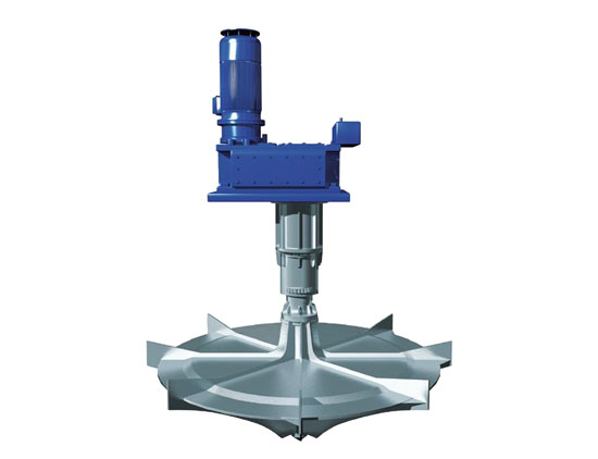 采用立式摆线针轮减速机。通过连轴器与浸没于水中的倒伞形叶轮直接相联,并且驱动叶轮旋转。在叶轮的提水、输水的作用下,使池内的液体剧烈搅动,不断产生水跃和循环流动,并且在叶轮片后侧形成负压吸入空气。实现曝气池内的污水充氧效果。该装置常以一池单机或多机布置于氧化沟及大小不同类型的污水生化处理曝气池。主要用于Carrousel型氧化沟,安装于氧化沟两端。