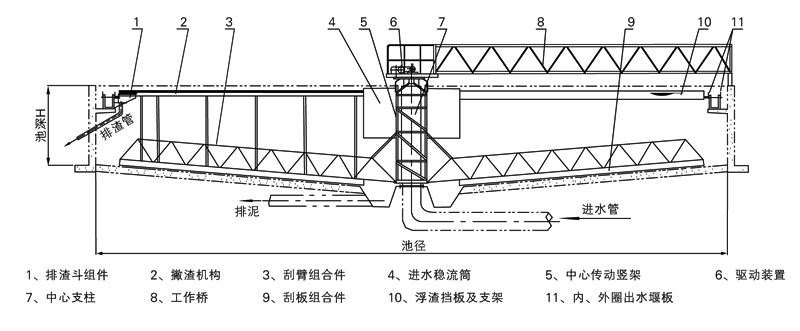该机采用中心传动垂架式,上部设有浮渣收集装置,池壁四周设溢流装置及浮渣排出装置,从中心配水及排泥,该机具有传递扭矩大,运转平衡,稳流效果好等优点。