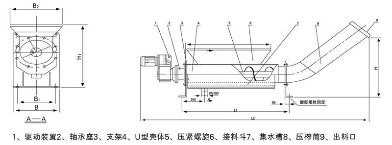 该设备采用有轴螺旋式,当物料从进料斗进入,通过螺旋体将栅渣推至出料管道内,依靠栅渣重力压缩后推出出料口,直接排放至垃圾小车内外运,压出的废水通过滤网和集水管经排水管排除。