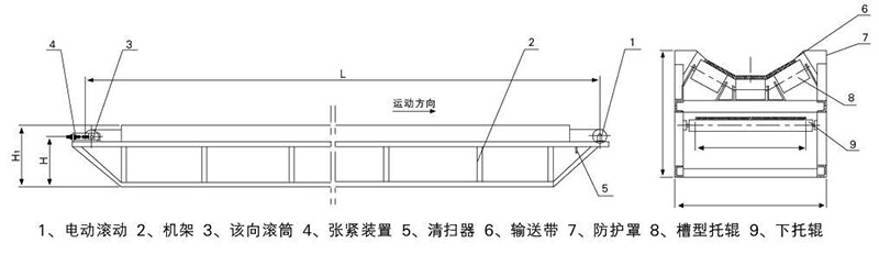 驱动装置采用油冷式电动滚筒,防护等级IP55,结构紧凑,占地面积小,易维护;